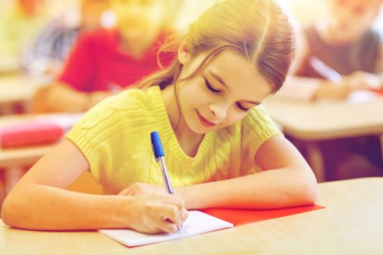 Wallpaper Little girl schoolgirl writes pen in notebook