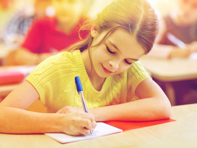 Wallpaper Little girl schoolgirl writes pen in notebook