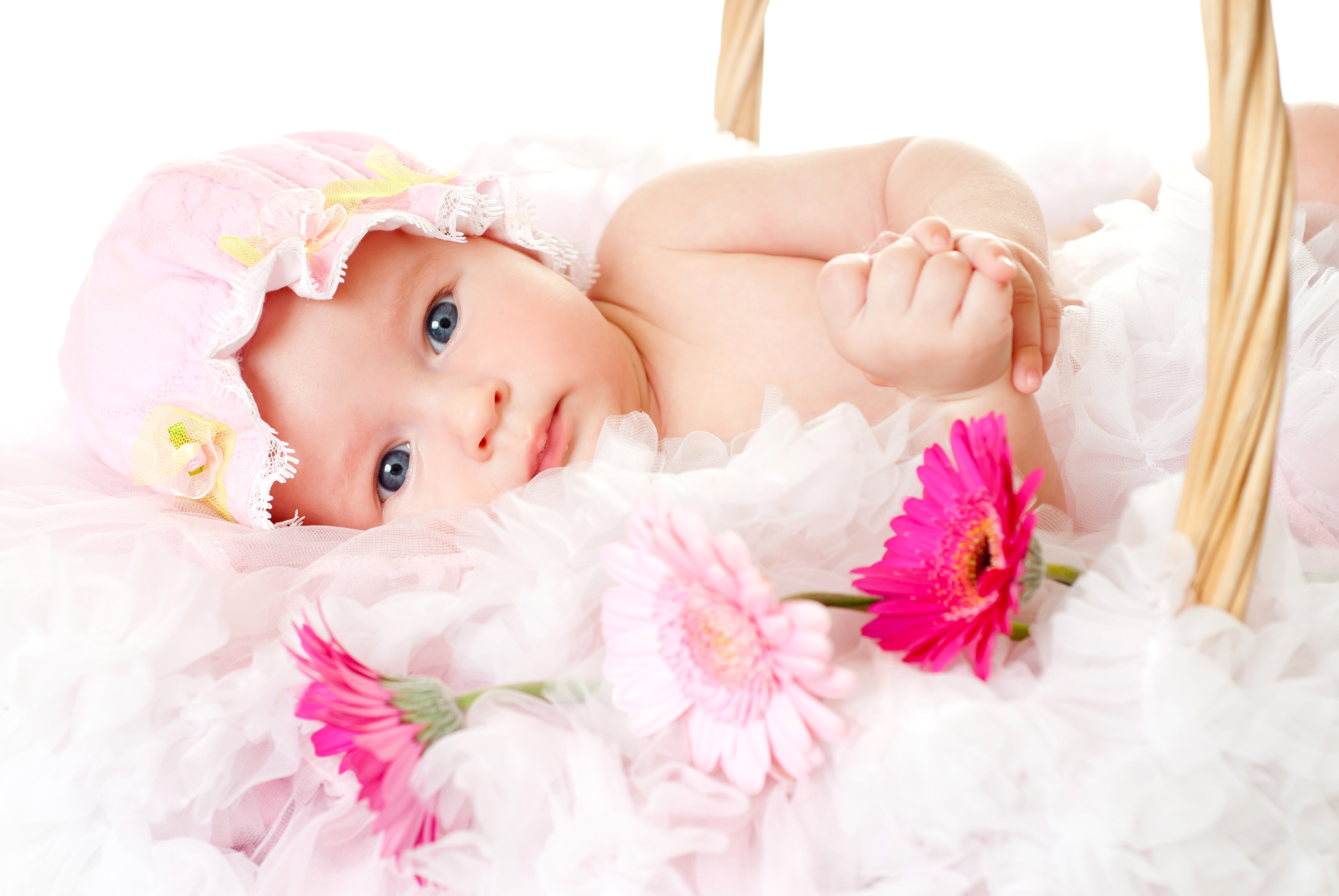 Wallpaper Sweet girl with hat with three flowers of gerbera