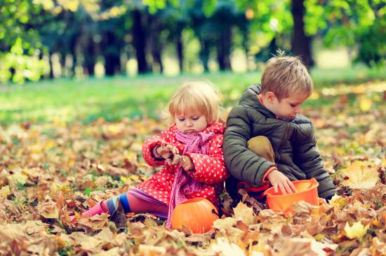 Wallpaper Little boy and girl sitting on yellow foliage in autumn park