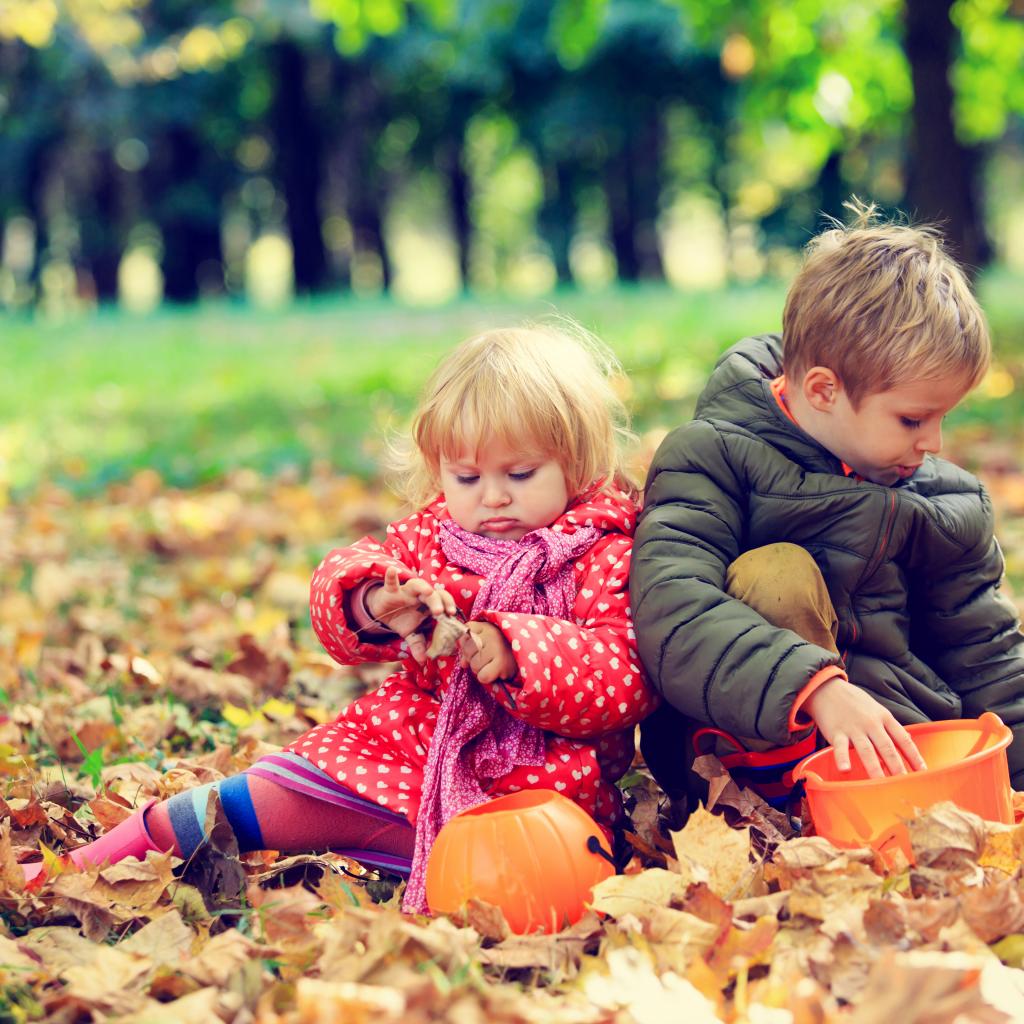 Wallpaper Little boy and girl sitting on yellow foliage in autumn park