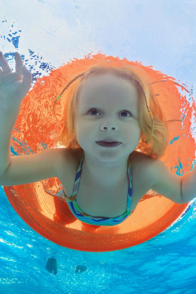Wallpaper A little girl is swimming in the pool with a life buoy