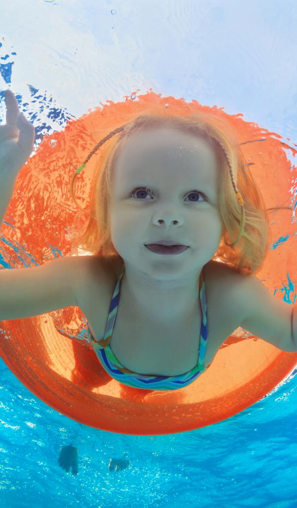 Wallpaper A little girl is swimming in the pool with a life buoy