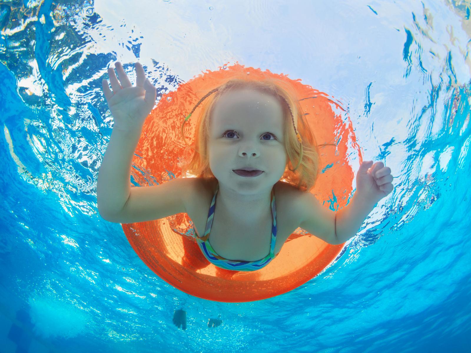 Wallpaper A little girl is swimming in the pool with a life buoy