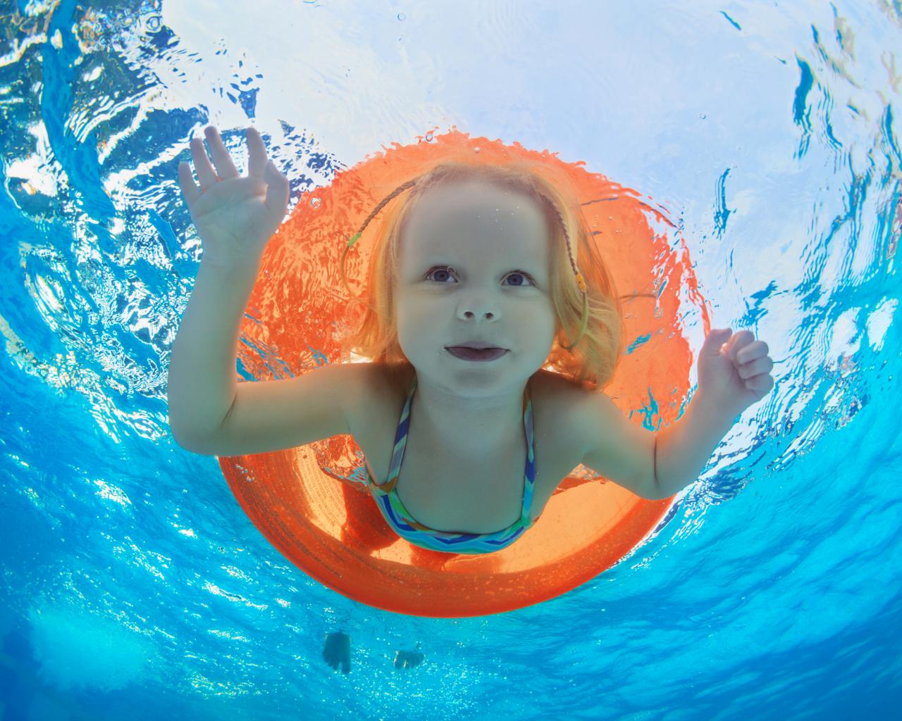 Wallpaper A little girl is swimming in the pool with a life buoy