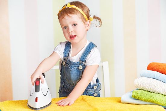 Wallpaper A little girl with an iron strokes a towel