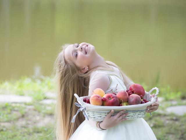 Wallpaper Little smiling girl in white dress with basket of fruit