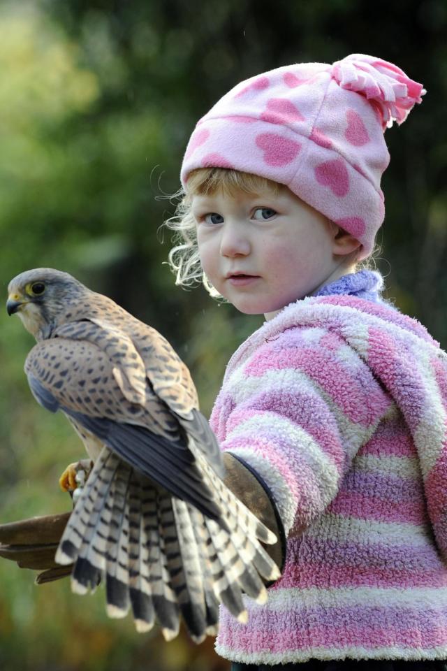 Wallpaper Little girl with a bird a falcon on her hand