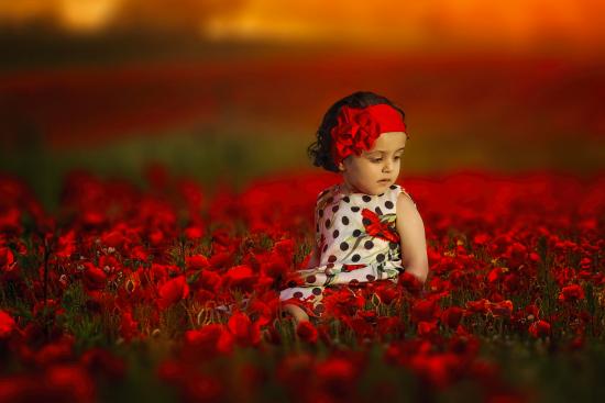 Wallpaper Little girl is sitting in a field with red poppies