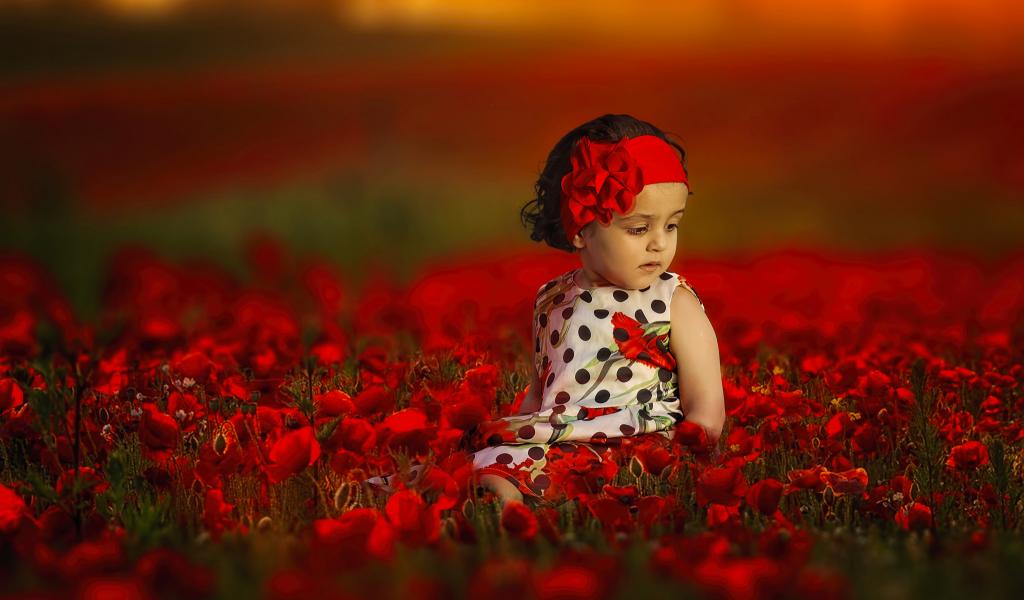 Wallpaper Little girl is sitting in a field with red poppies