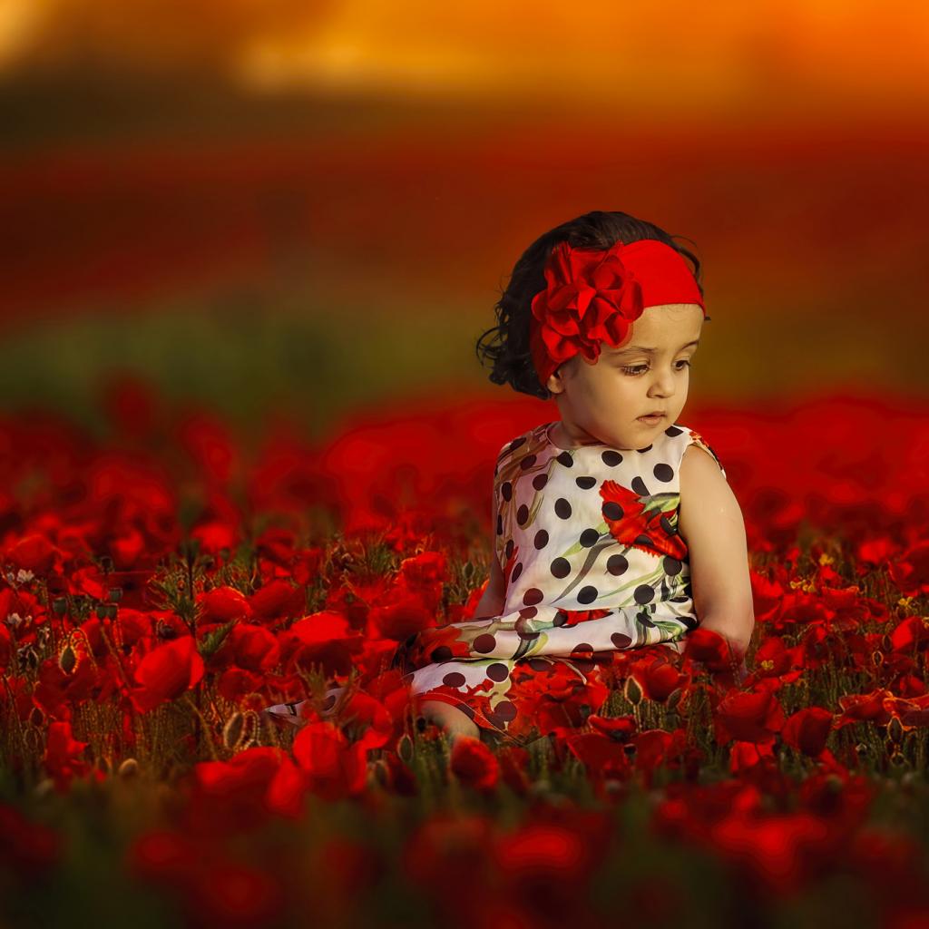 Wallpaper Little girl is sitting in a field with red poppies