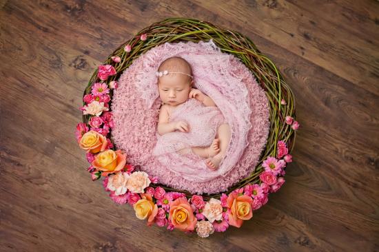 Wallpaper Little girl is sleeping in a basket decorated with flowers