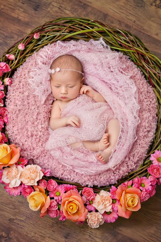 Wallpaper Little girl is sleeping in a basket decorated with flowers