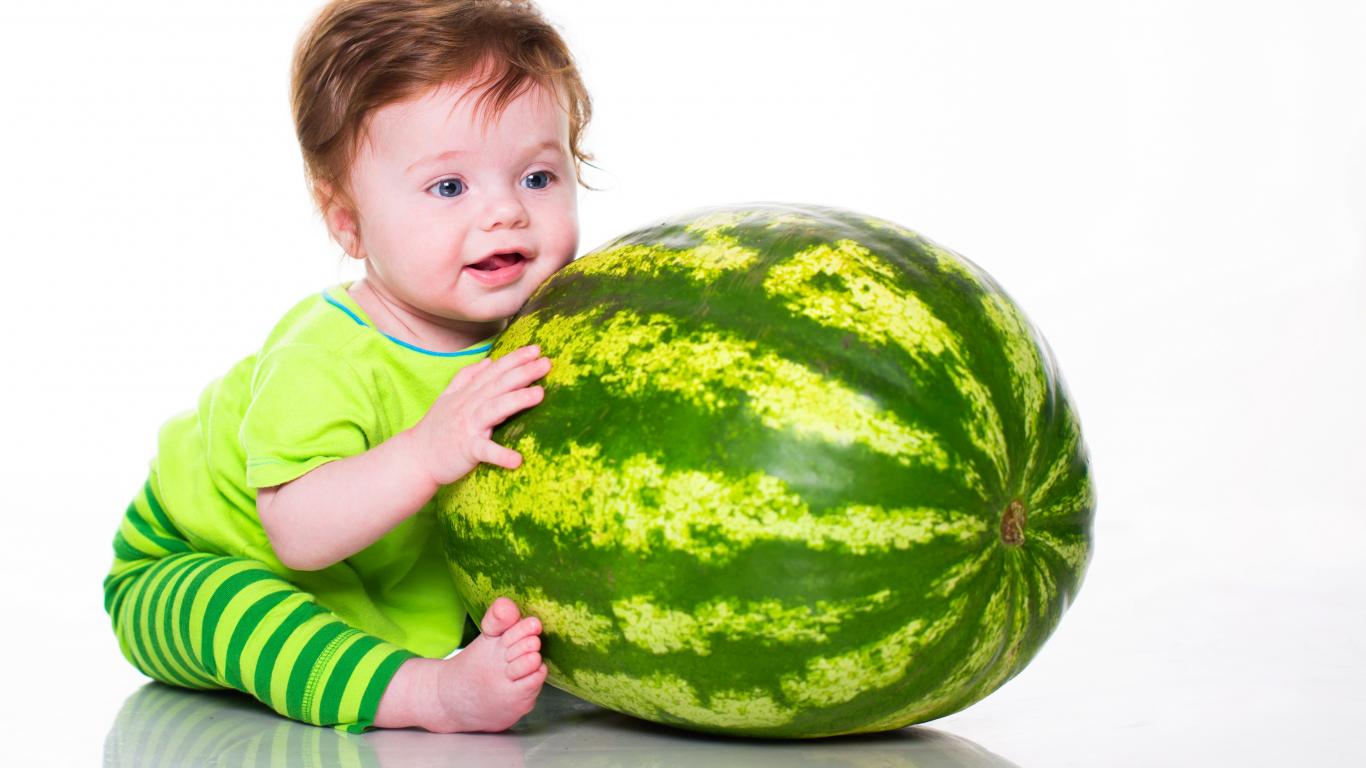 Wallpaper A small blue-eyed boy with a big green watermelon