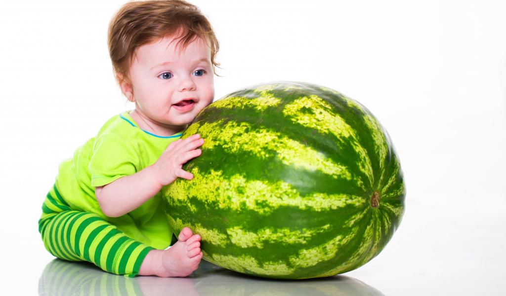 Wallpaper A small blue-eyed boy with a big green watermelon