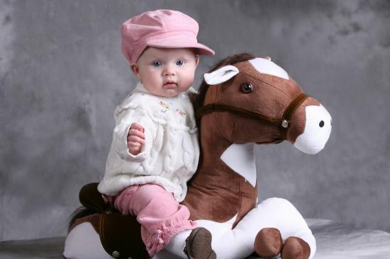 Wallpaper Little girl in a pink cap sits on a toy horse