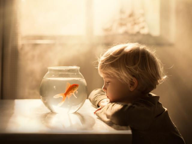 Wallpaper Little boy looks at aquarium with golden fish