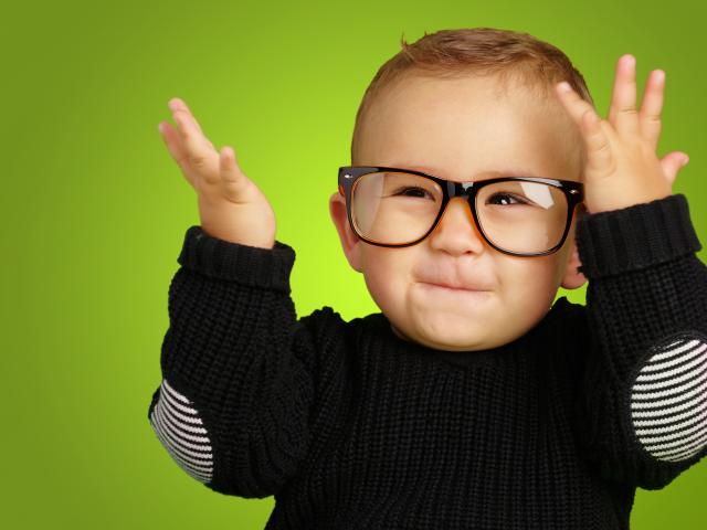 Wallpaper Little smiling boy in glasses is sitting in a red suitcase