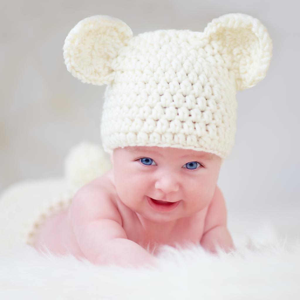 Wallpaper Blue-eyed baby in a white knitted hat with ears