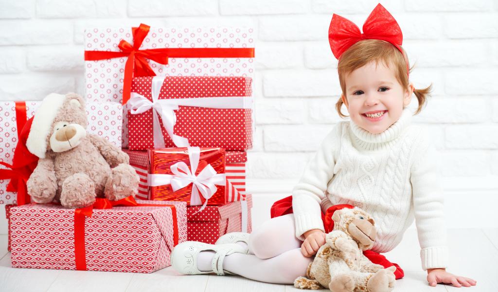 Wallpaper Little smiling girl with gifts for the new year