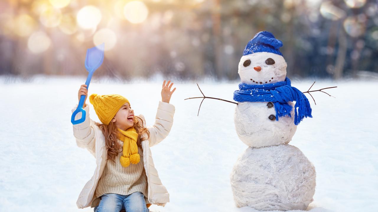 Wallpaper Little smiling girl with a snowman in winter