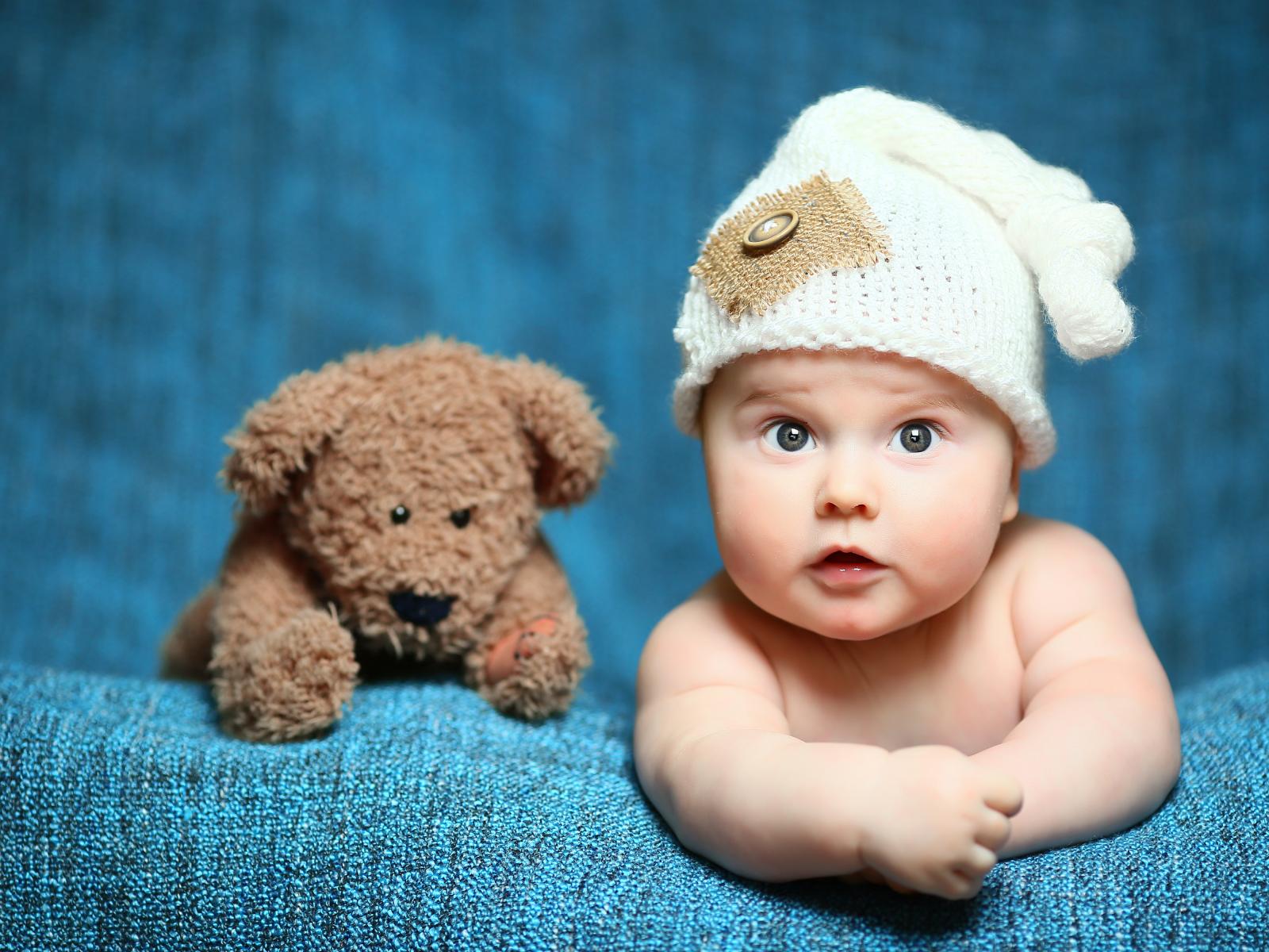 Wallpaper A small child with a beautiful white hat with a teddy bear