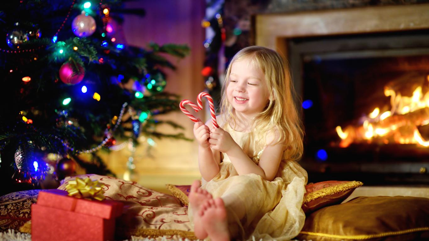 Wallpaper Long-haired blonde girl with lollipops near Christmas tree