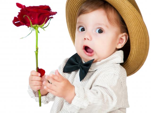 Wallpaper Funny little boy in a hat with a red rose in his hand