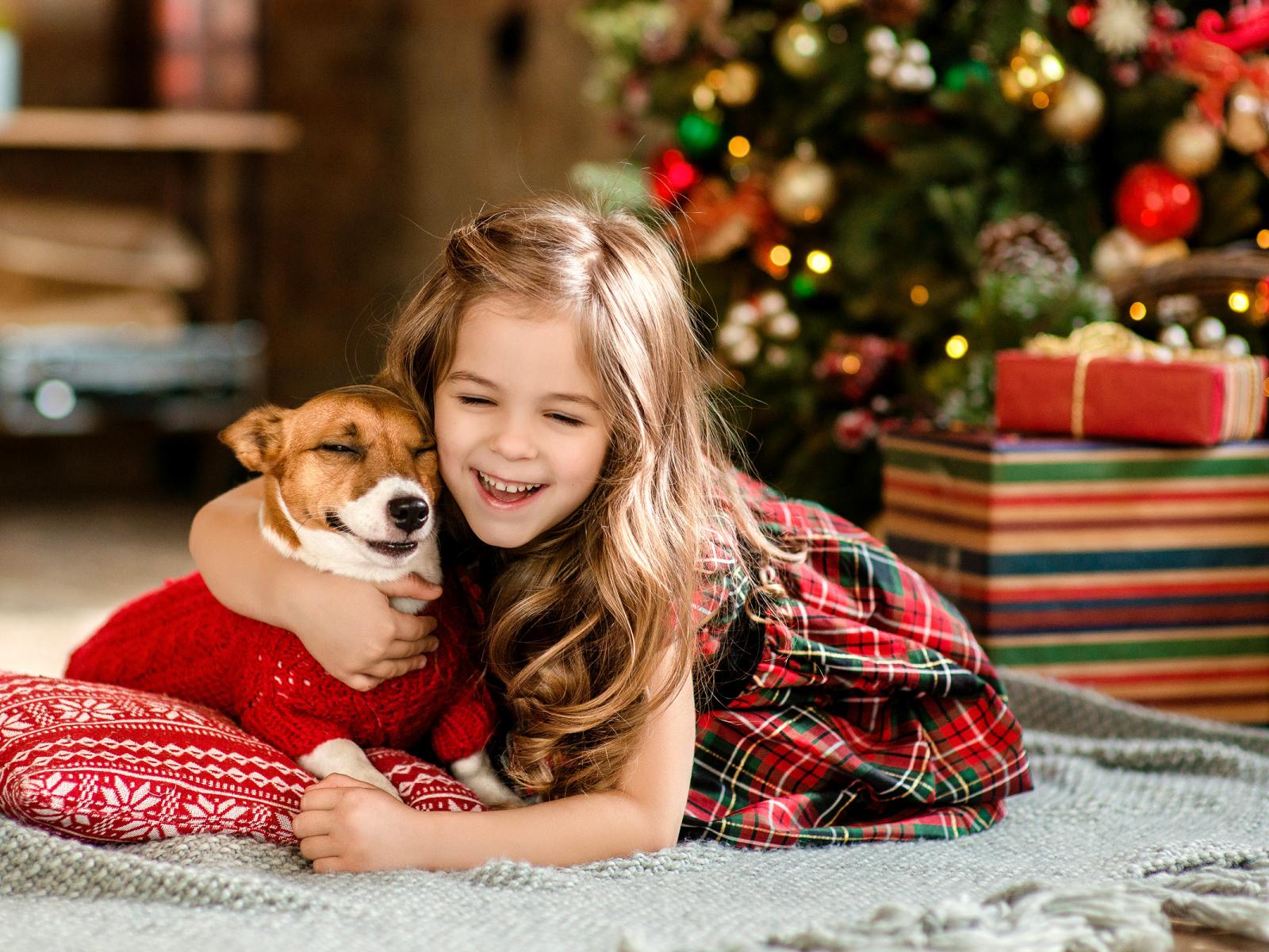Wallpaper A little girl with a dog is enjoying the new year