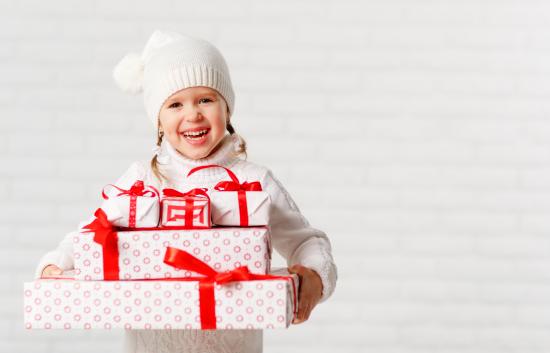Wallpaper Laughing girl in a white hat with Christmas gifts