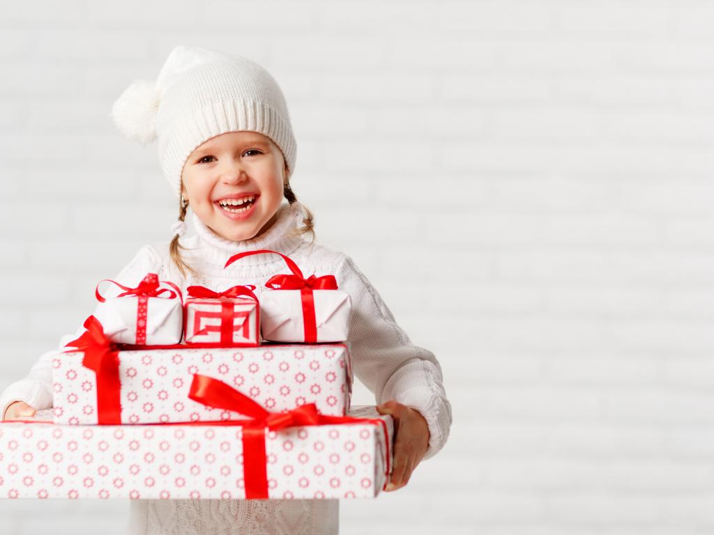 Wallpaper Laughing girl in a white hat with Christmas gifts