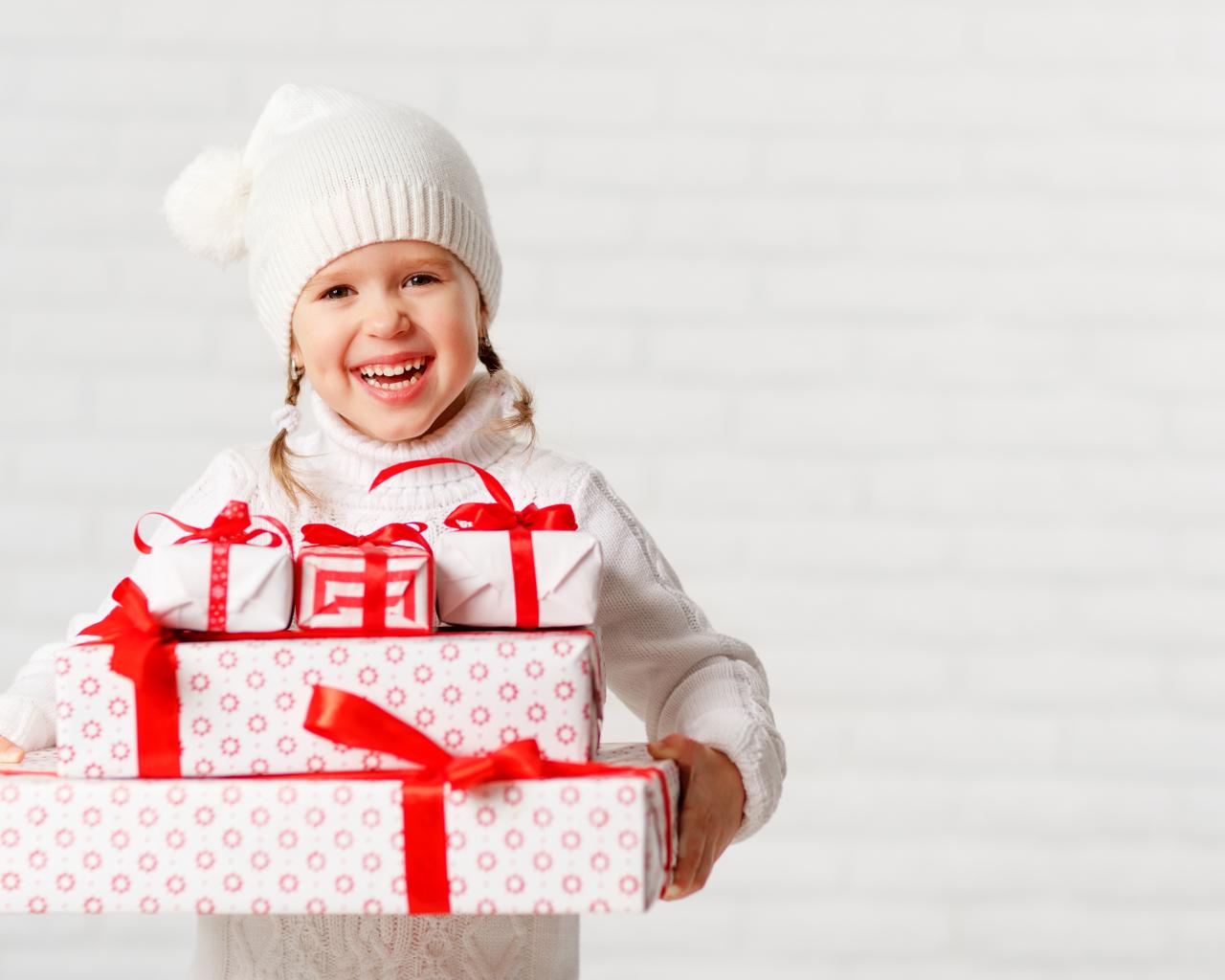 Wallpaper Laughing girl in a white hat with Christmas gifts