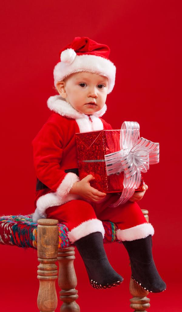 Wallpaper A little boy is sitting on a chair with a New Year`s gift