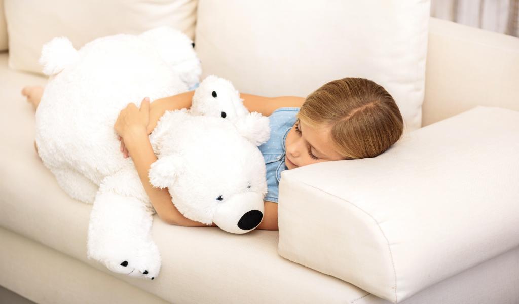Wallpaper Little girl is sleeping with a white teddy bear on the couch