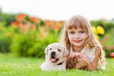 Wallpaper Little blonde girl with a puppy in blue colors