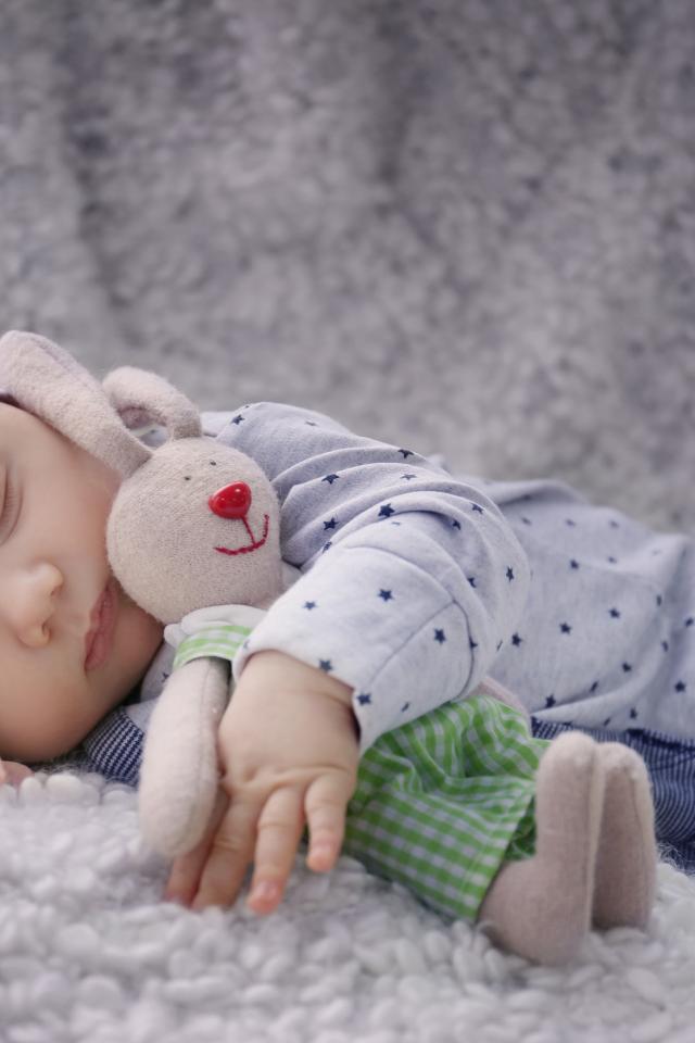 Wallpaper Cute baby sleeping in a little cot on a gray background