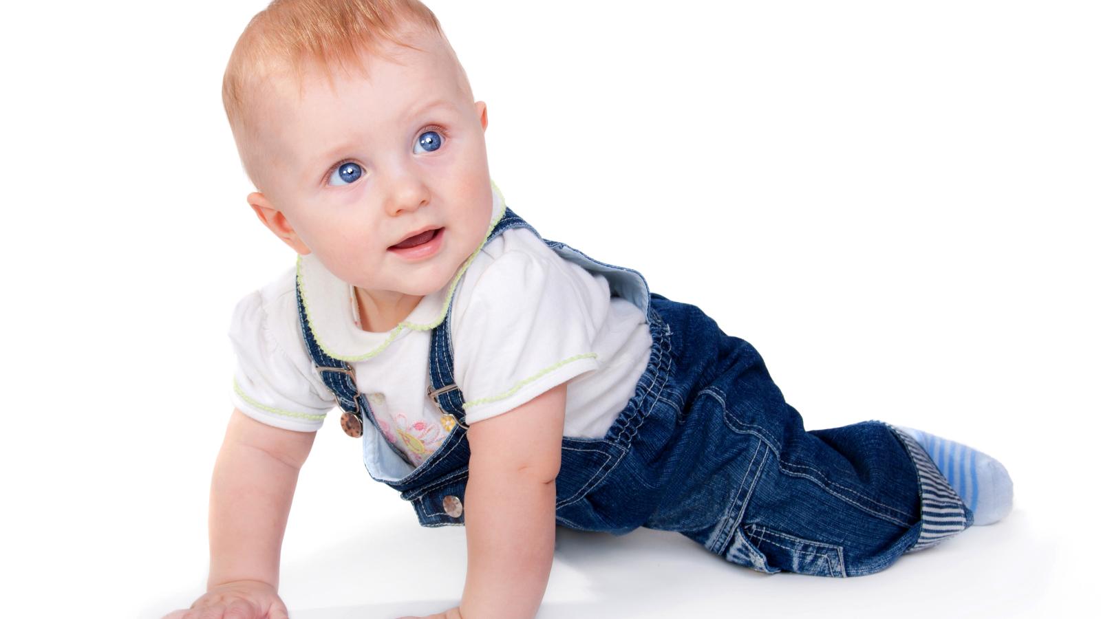 » Wallpaper Little boy in blue overalls on white background