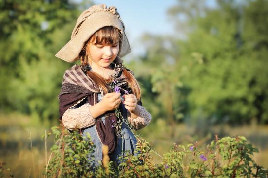 Wallpaper Little girl in a suit gathers grass