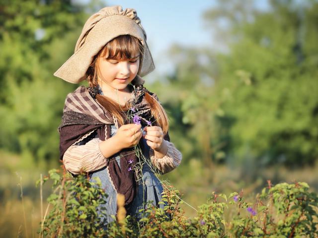 Wallpaper Little girl in a suit gathers grass