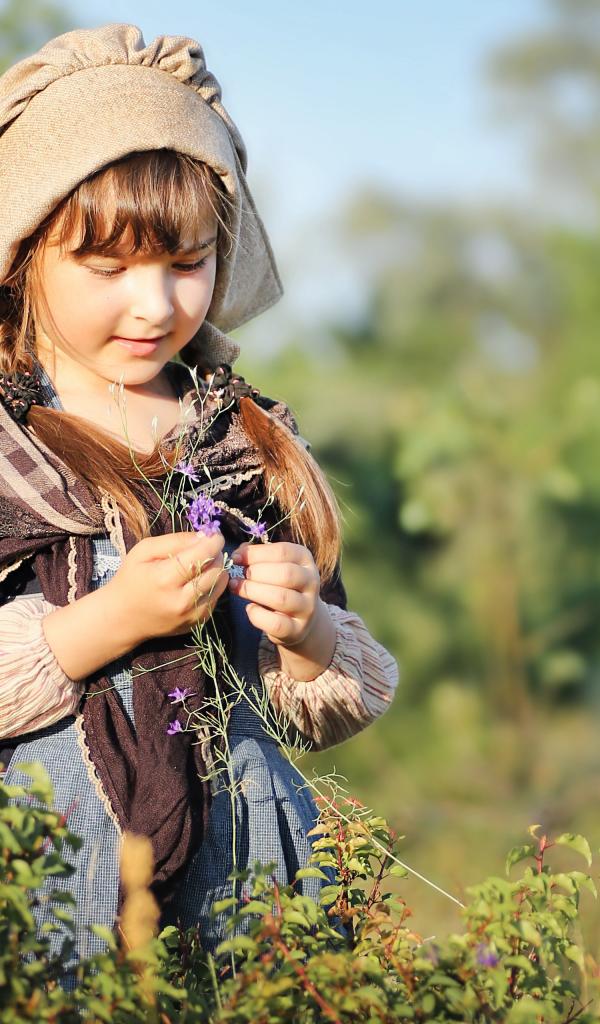 Wallpaper Little girl in a suit gathers grass