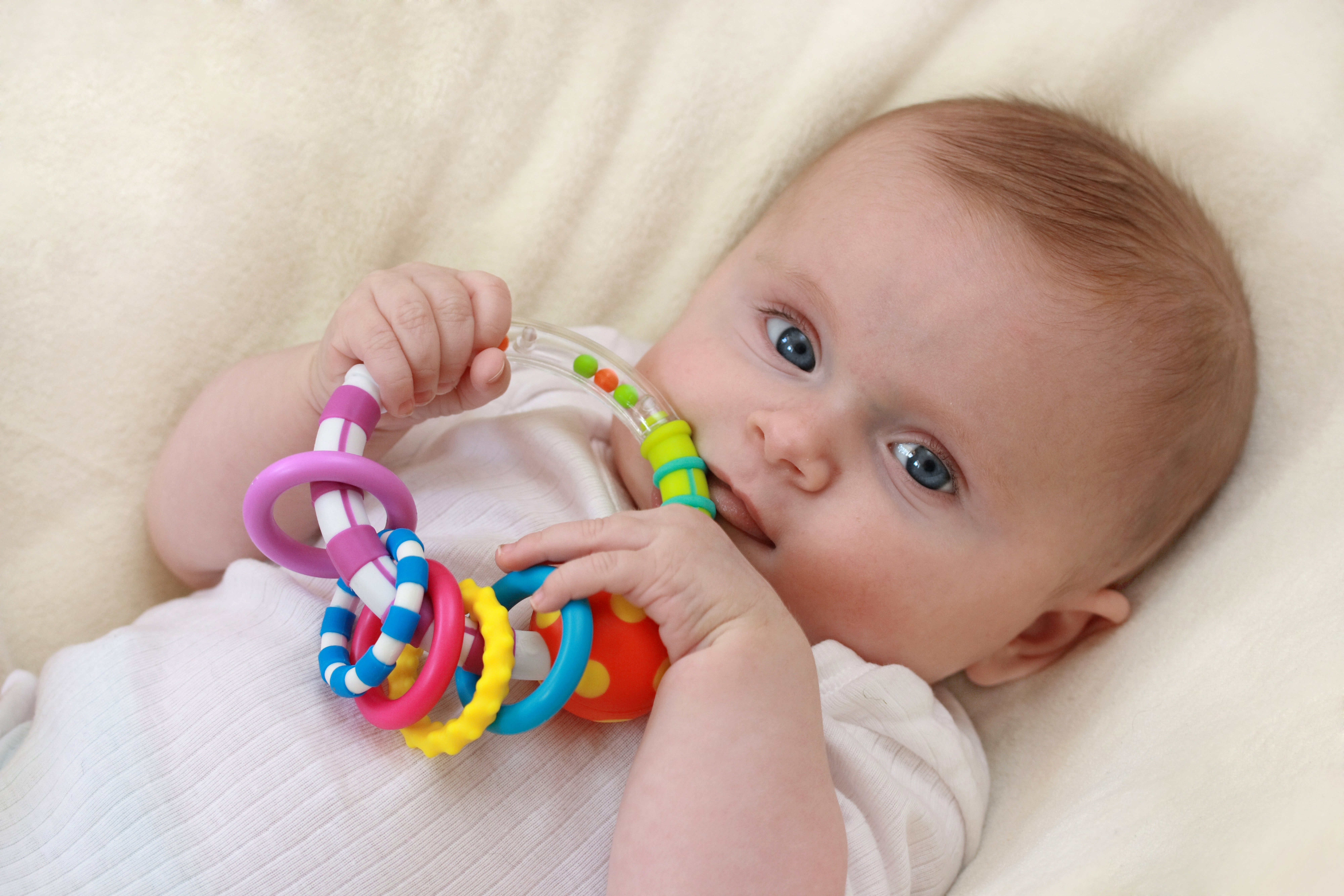 Wallpaper Smiling blue-eyed baby girl with toy in hands