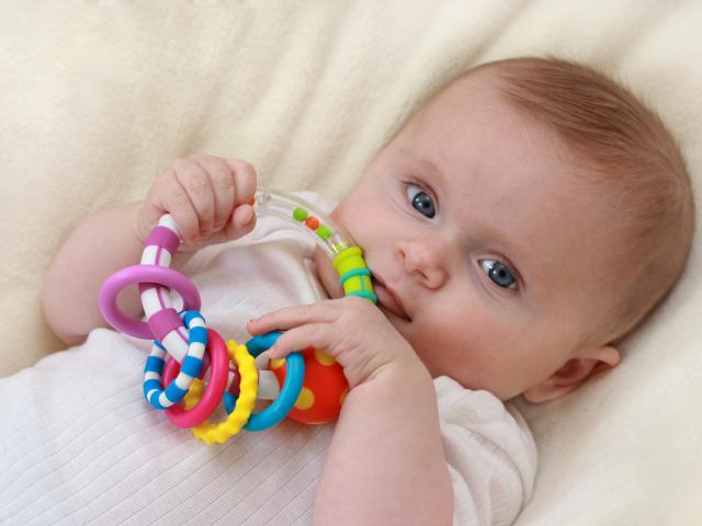 Wallpaper Smiling blue-eyed baby girl with toy in hands