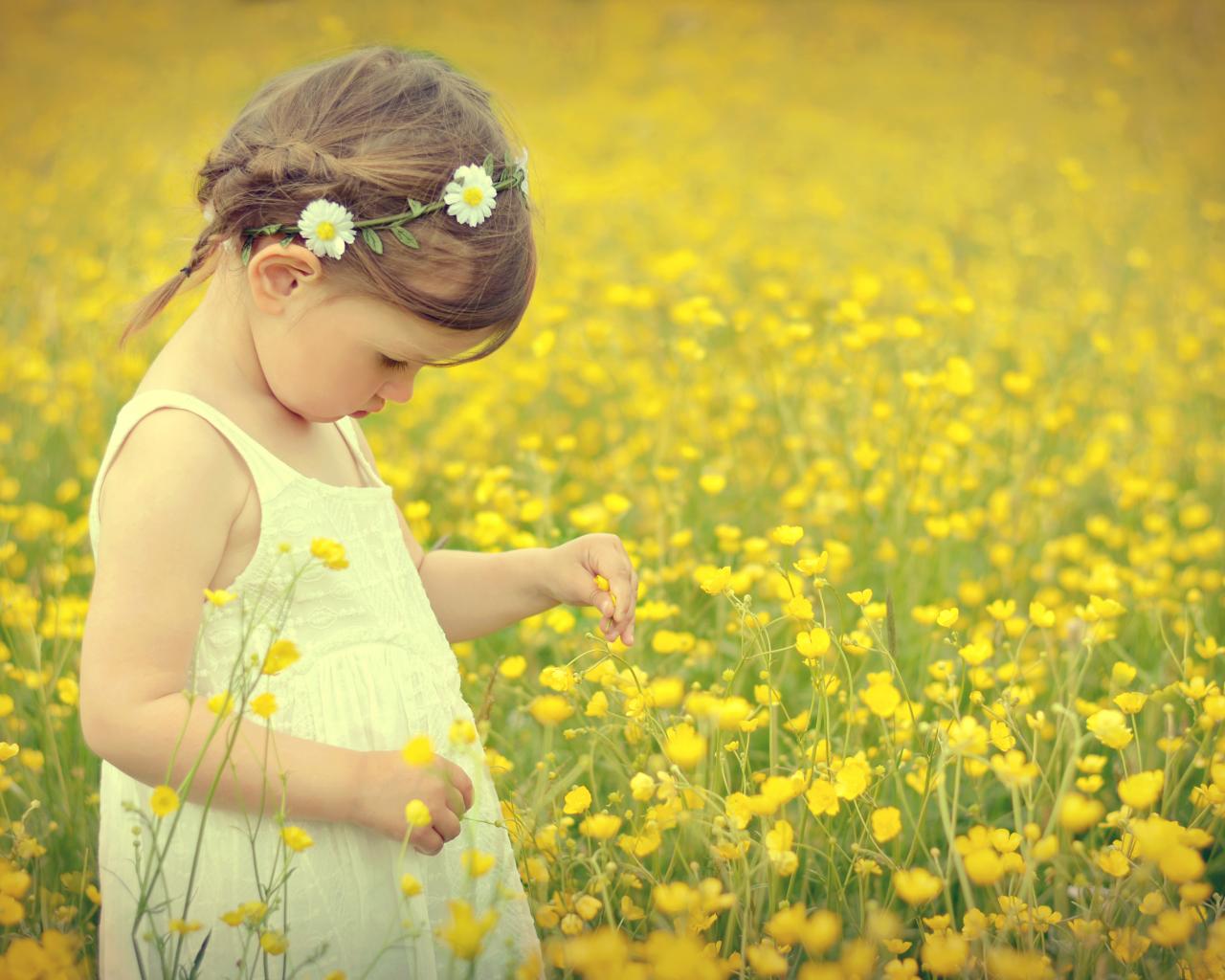 Wallpaper Little girl in a white dress in a meadow with yellow flowers