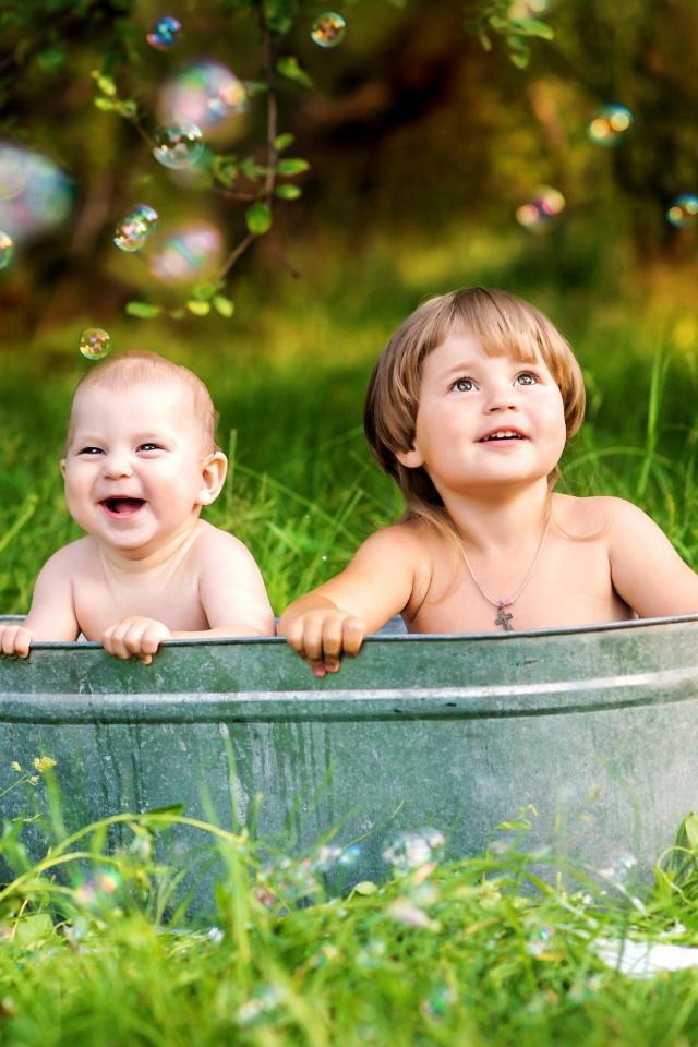 Wallpaper Two small children sit in an iron trough on a green grass