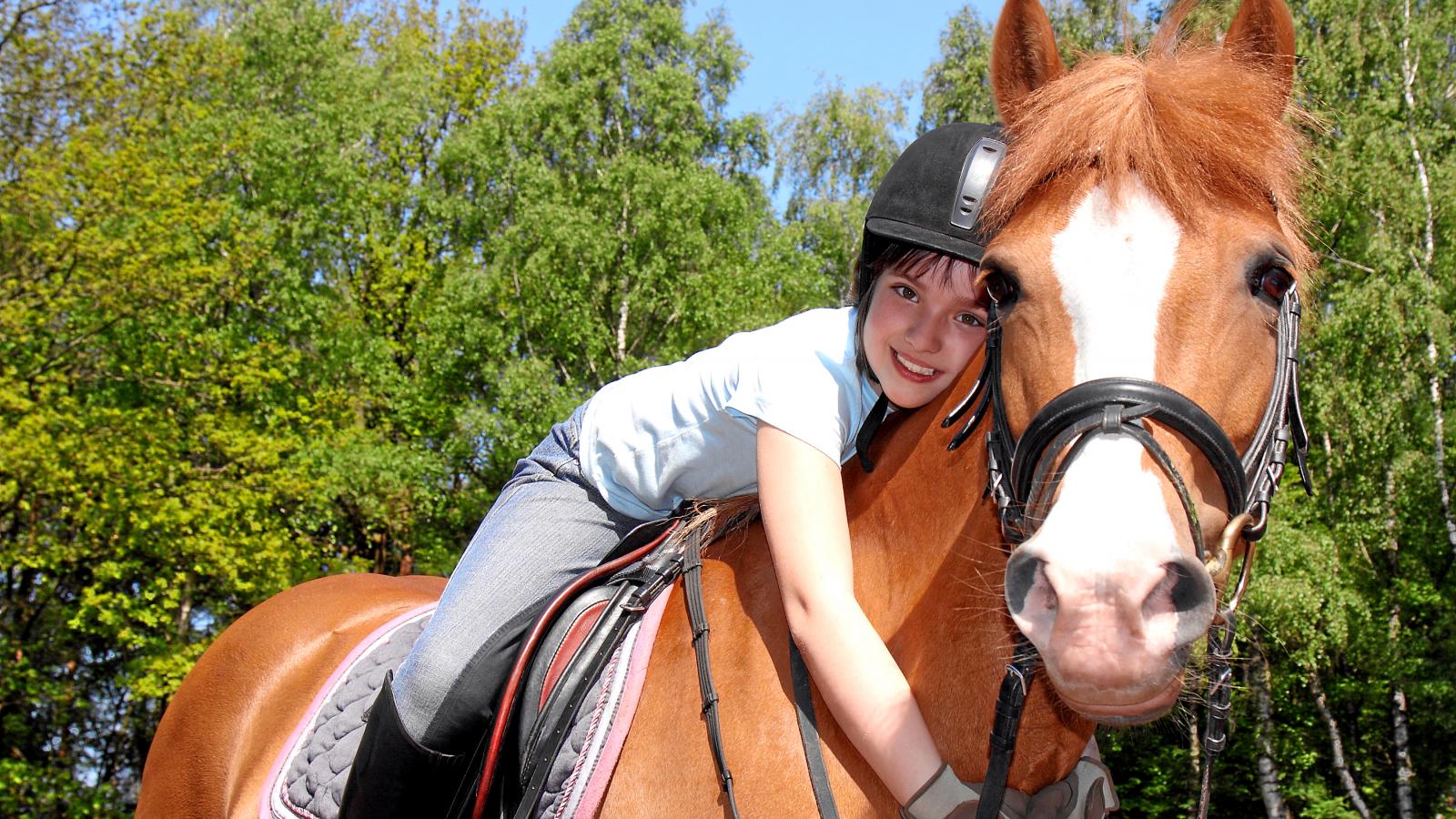 Wallpaper Little girl is sitting on a brown horse