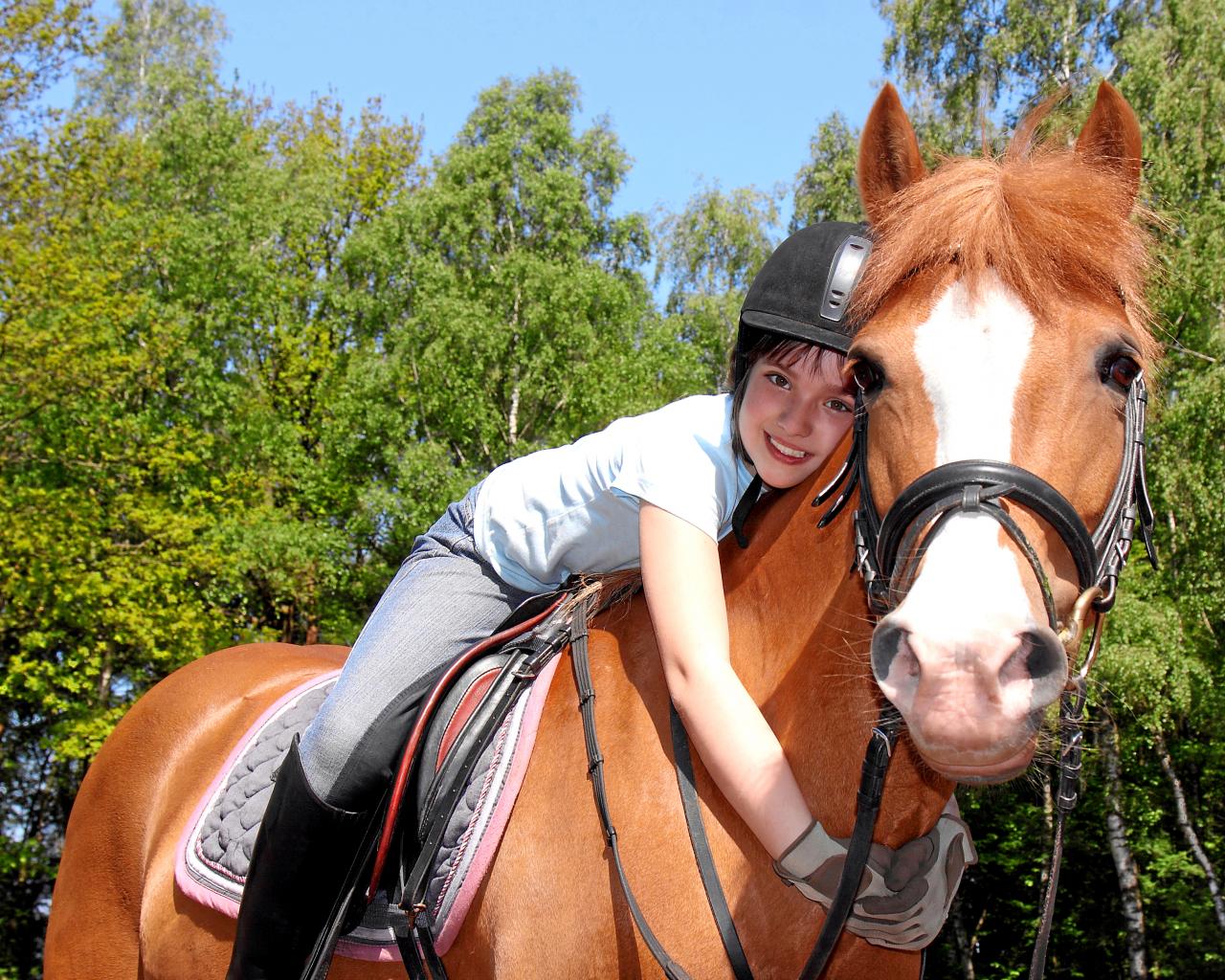 Wallpaper Little girl is sitting on a brown horse