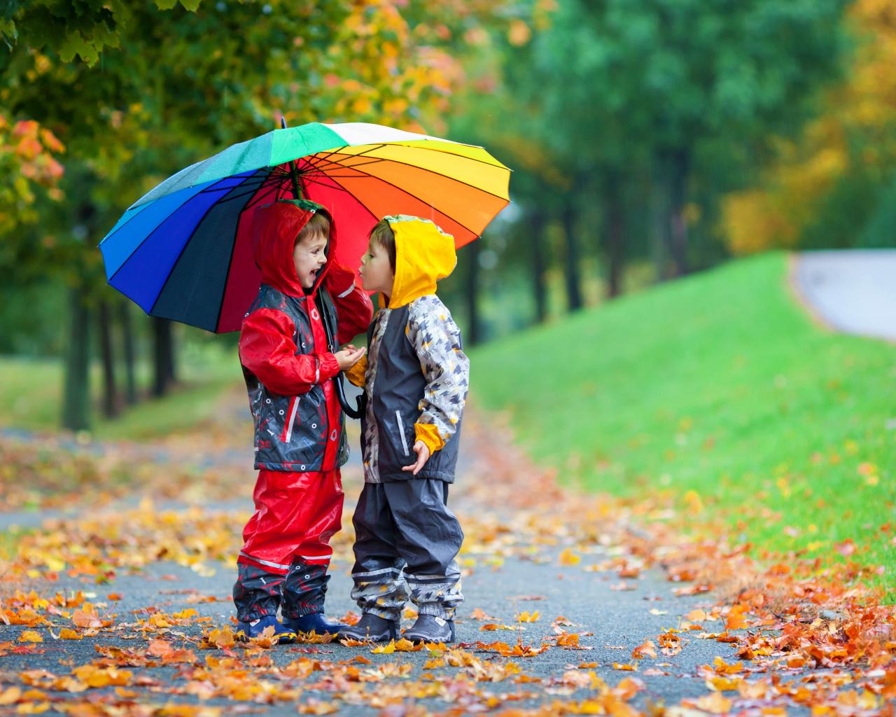 Wallpaper Two boys under a colorful umbrella in autumn