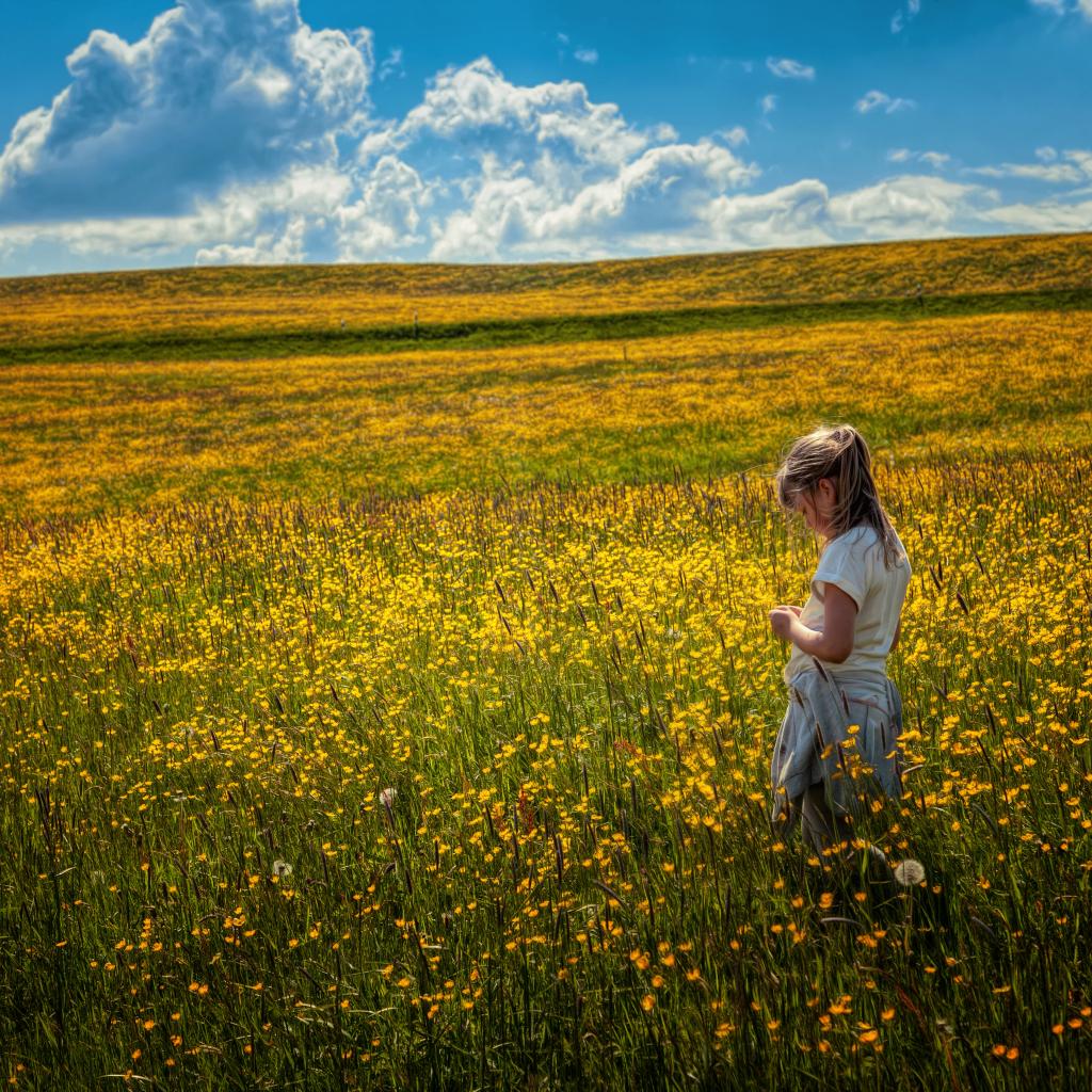 Wallpaper Little girl walking through the field with yellow flowers
