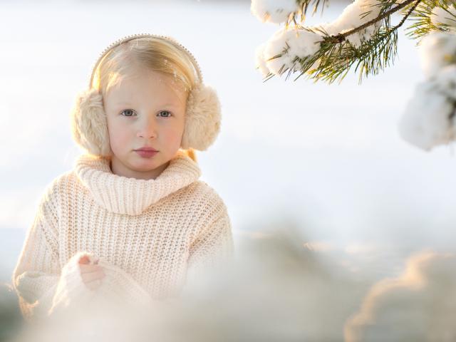 Wallpaper A little girl in a white sweater at a snow-covered fir