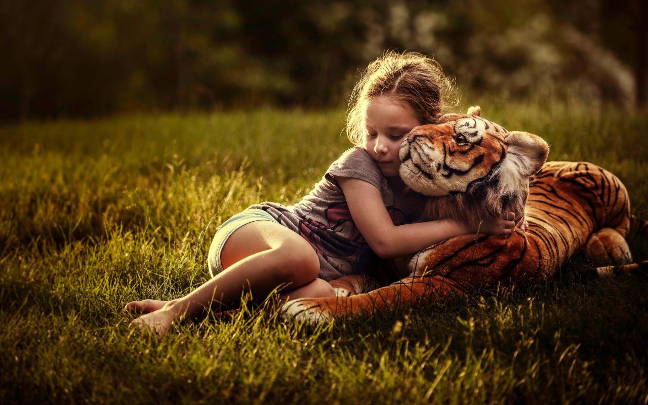 Wallpaper Little girl hugging a toy tiger on a green grass